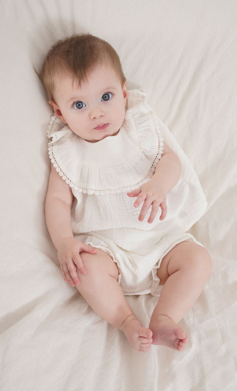 Conjunto de gasa. Camisola tiene cartera con botones en la espalda. Short con elástico en cintira.