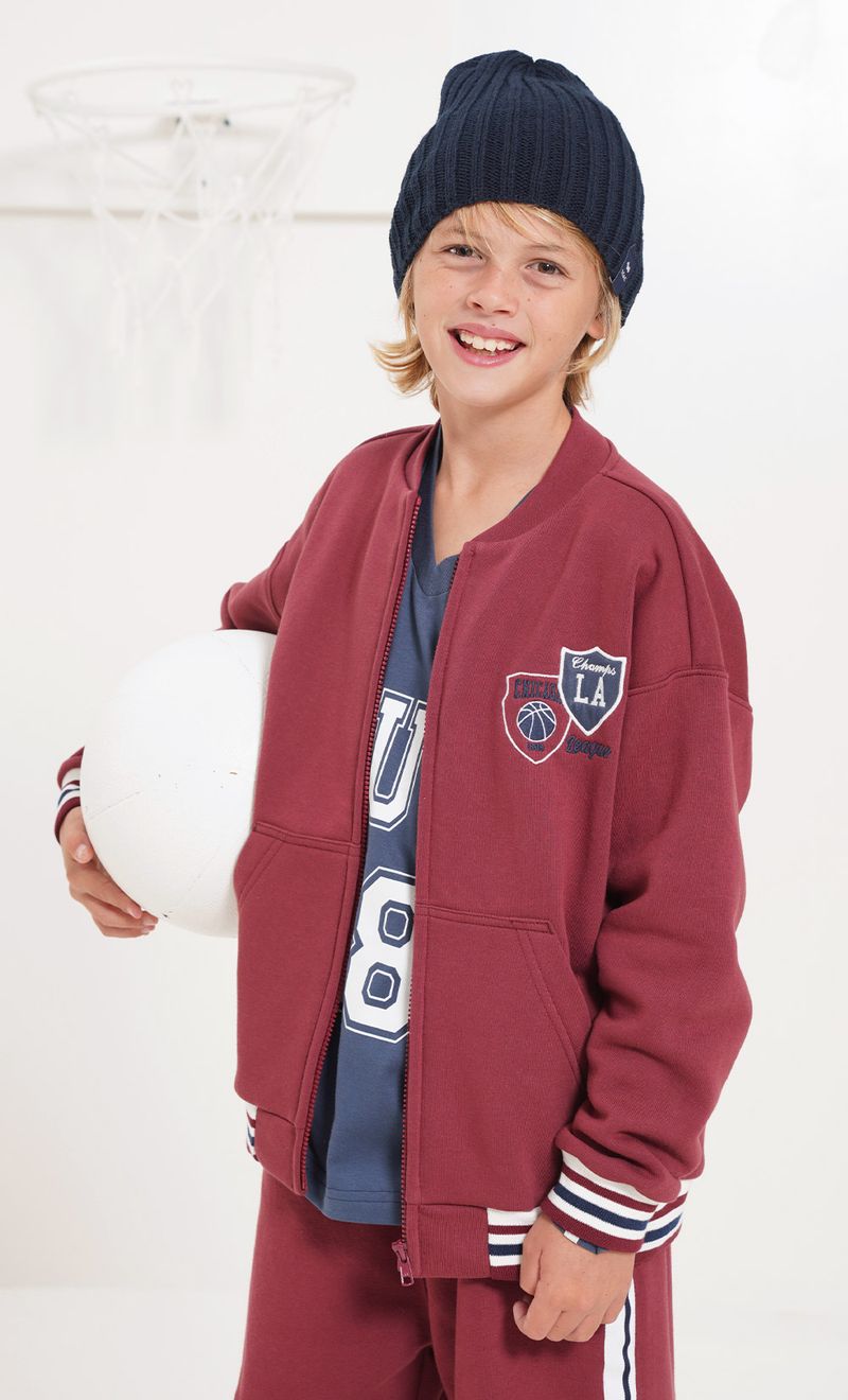 Cardigan de frisa,tiene puños tejidos rayados.Apliques bordados en delantero