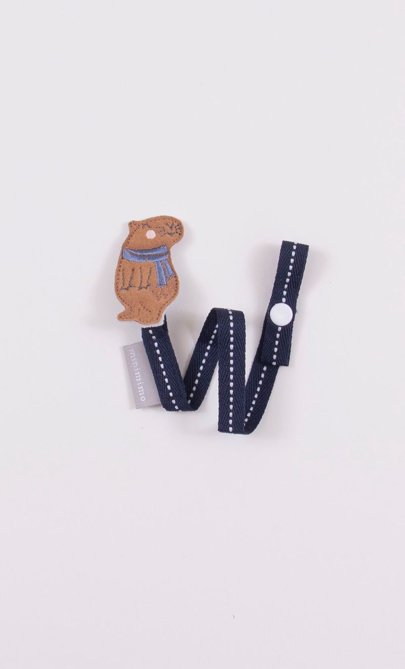Portachupete de pielcita con aplique de carpincho y broche de plástico para el agarre.