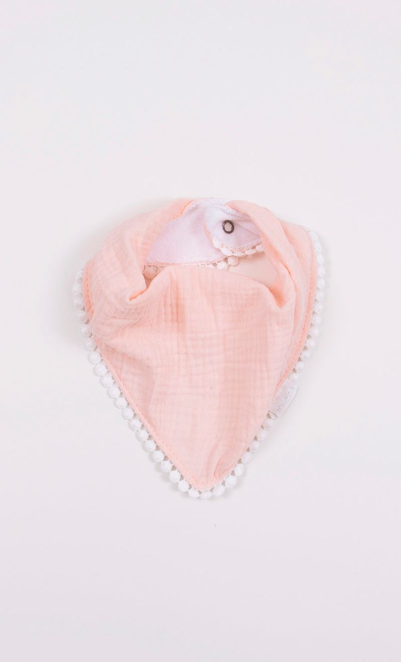 Babero de bambula tipo pañuelo con aplique de borlitas. Tiene toalla absorbente en la parte de atrás.