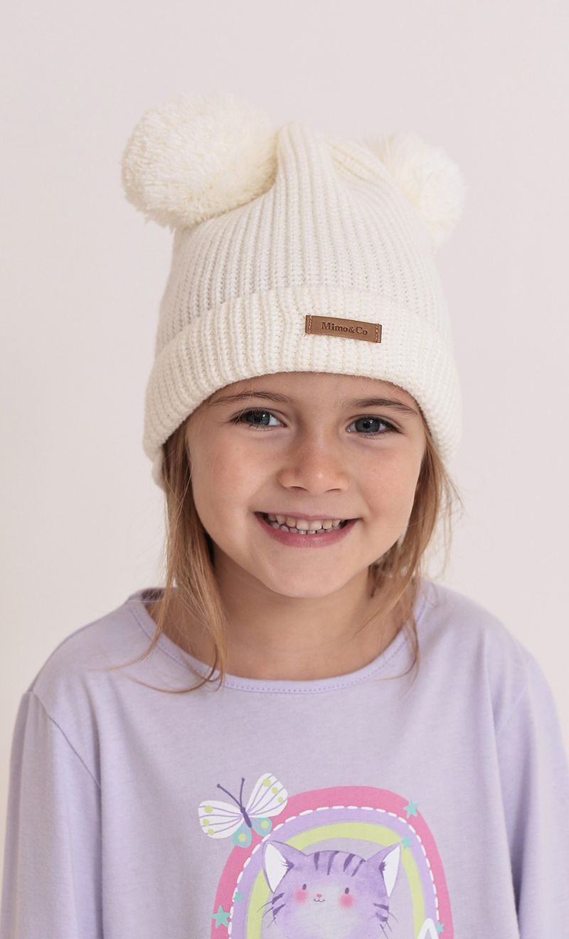 Gorro tejido con aplique de pompones.