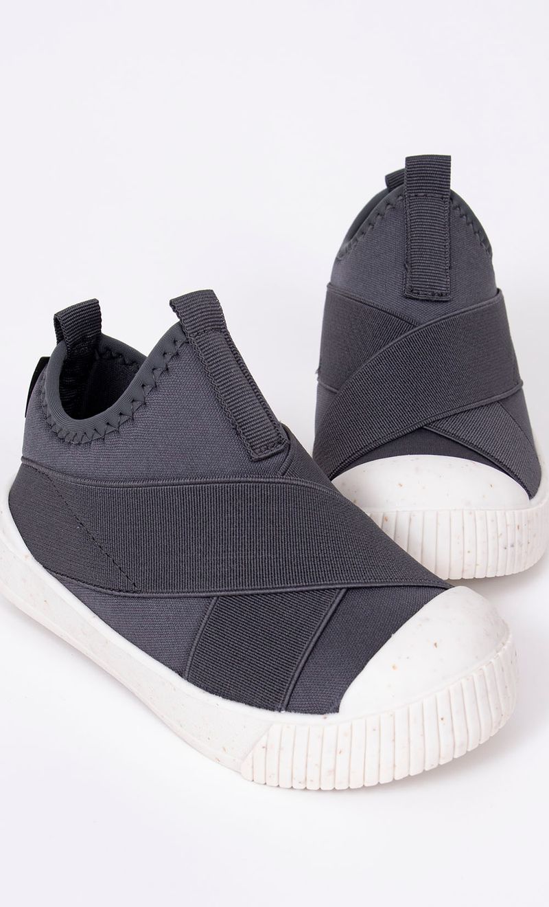 Zapatilla confeccionada en textil elastizado de calce fácil. Tiene dos elásticos cruzados sobre el empeine para un mejor ajuste. La plantilla es plana. La suela es liviana y flexible, de goma sintética perfumada. La misma trae puntera para reforzada.