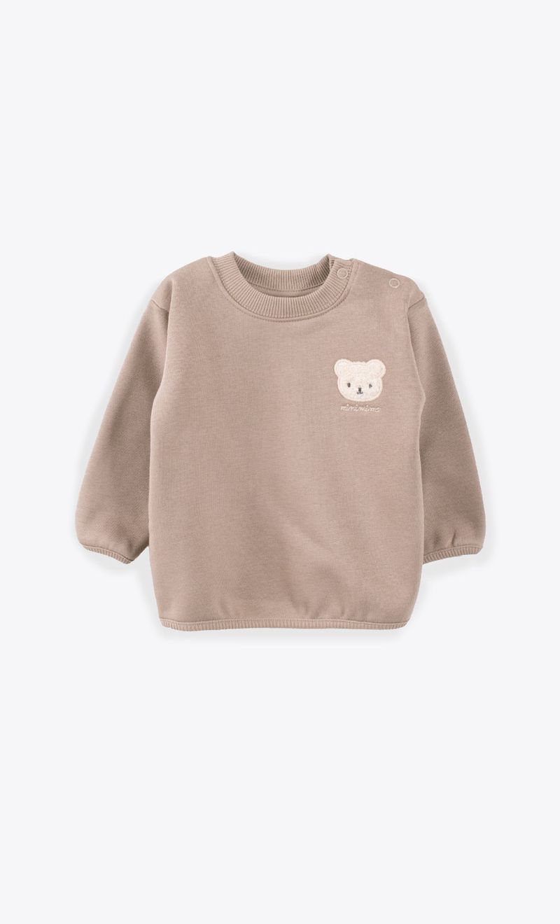 El buzo Mini Bear, hecho en frisa, suave y abrigada. Con un bordado buclé de osito adorable. Teine broche en cartera de hombro.