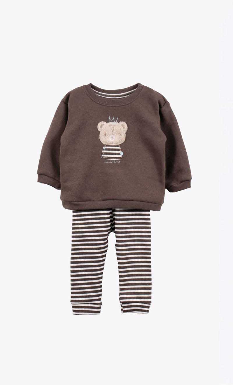 El conjunto Mini Osito, para un look muy tierno, el buzo hecho en frisa, con aplique bordado, tiene boche en escote. El pantalón en interlock desaujado estampado. Se pueden usar en conjunto o por separado.