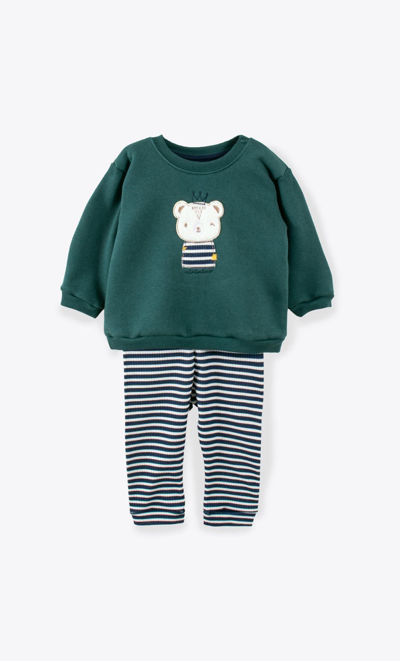 El conjunto Mini Osito, para un look muy tierno, el buzo hecho en frisa, con aplique bordado, tiene boche en escote. El pantalón de interlock desaujado estampado. Se pueden usar en conjunto o por separado.