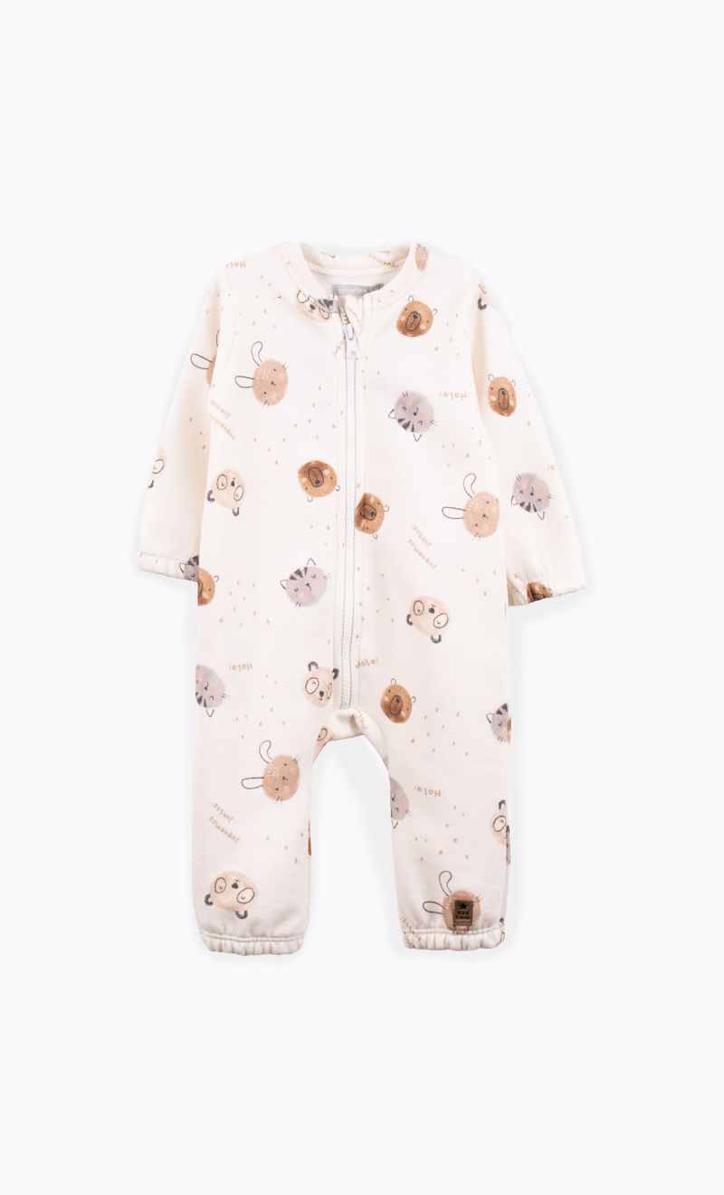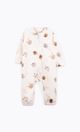 El enterito Mini Friends, hecho en frisa estampada, con broches en hombros y broches en entre piernas. Es suave y cómodo, para el uso diario del bebé.