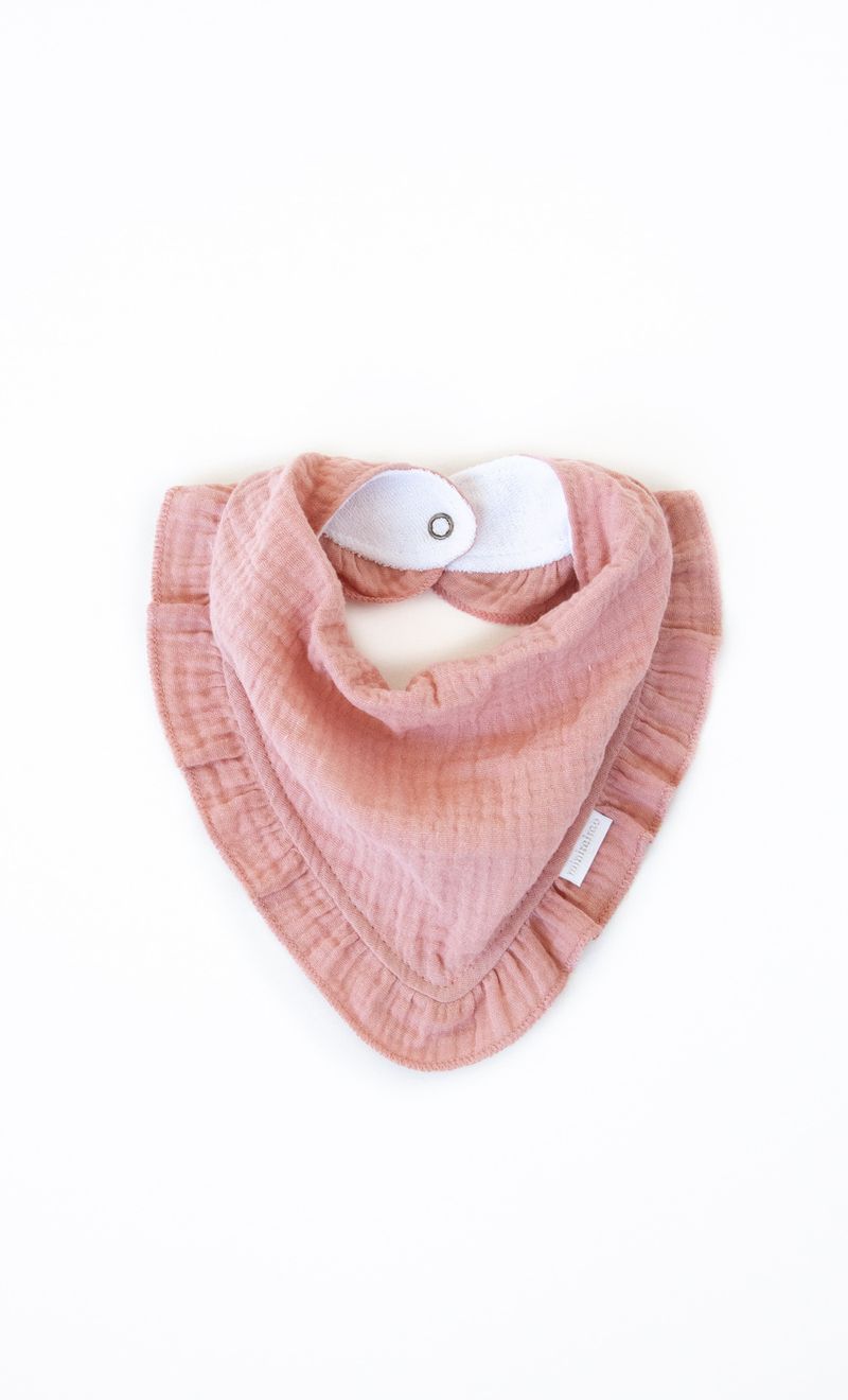 Babero Pañuelo de gasa con aplique de voladitos y toalla absorbente en la parte de atras.