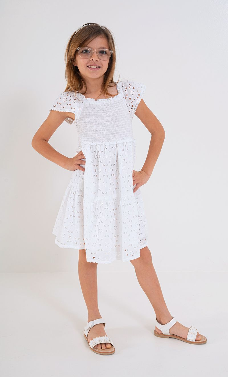 Vestido de broderie con hilo elástico en la parte superior, forrado en gasa.