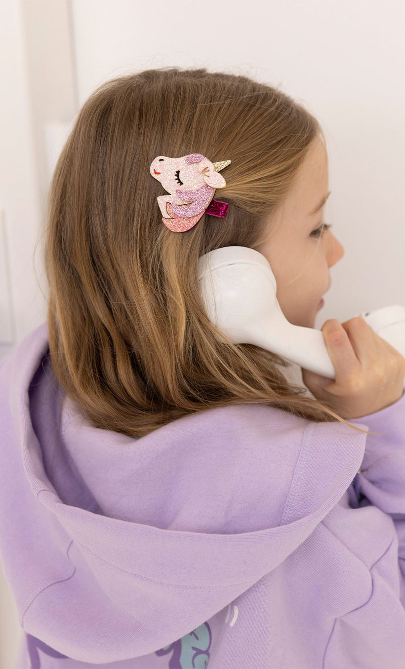 Un detalle pensado para sumar estilo. Pinza con aplique de unicornio combinada con brillo (Glitter).