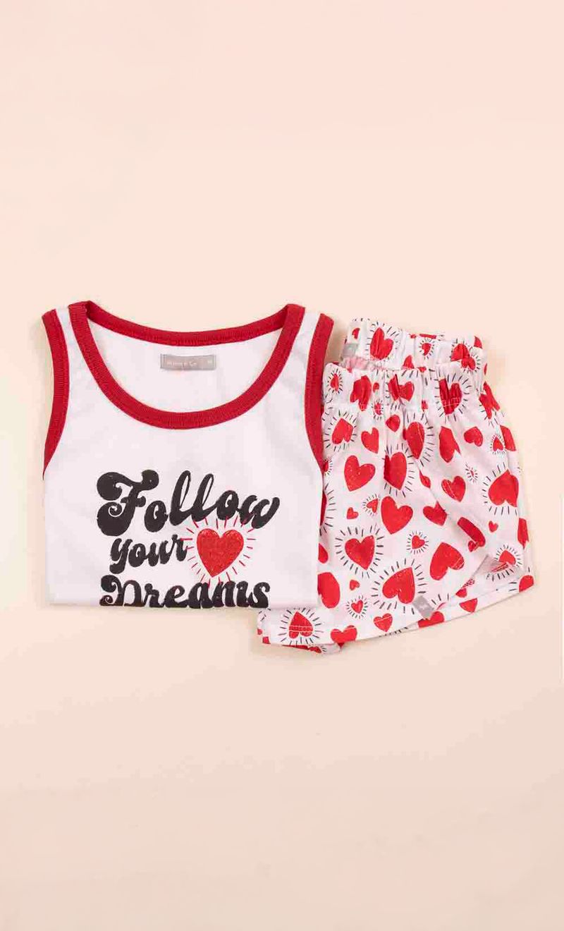 Pijama combinado: remera de rib con estampa en el frente con brillo (Glitter), short estampado de jersey con voladitos.