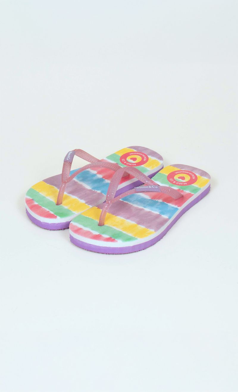 Ojota con base bicolor en goma eva ultra liviana y plantilla estampada. Las tiras son de material sintético, de color traslúcido, con particulas de brillo en su interior. Trae etiqueta de goma con logo de la marca.