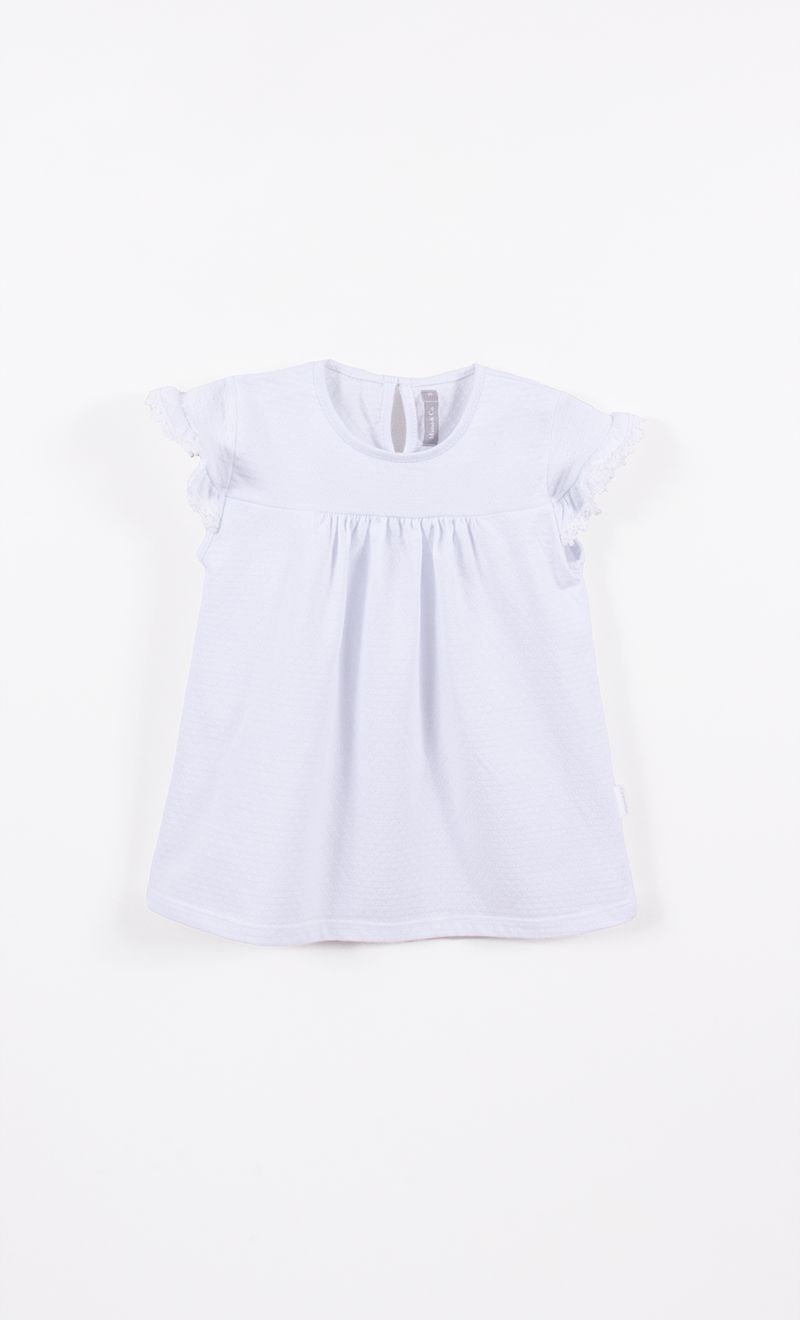 Camisola de jersey desaguajdo con puntilla en ruedo de mangas, tiene abertura con botón en la espalda.