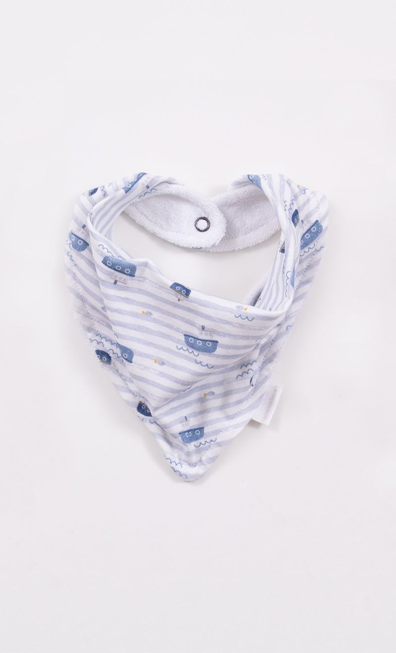 Un babero delicado y práctico, pensado para acompañar al bebé con suavidad en cada momento. Babero de jersey tipo pañuelo y toalla absorbente en la parte de atras.